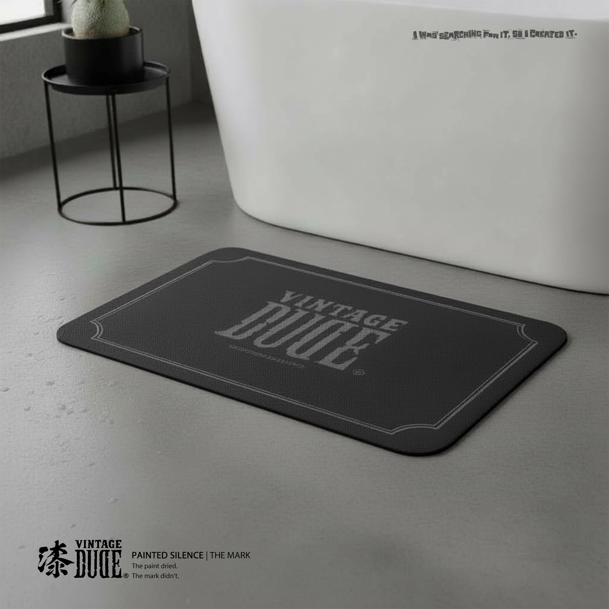 地墊採用 VINTAGE DUDE 字樣及品牌標語的暗色調印花,在黑色底色上創造出低調、豐富的層次感。外圍以復古相框式邊框點綴,使地墊兼具設計感與居家質感。