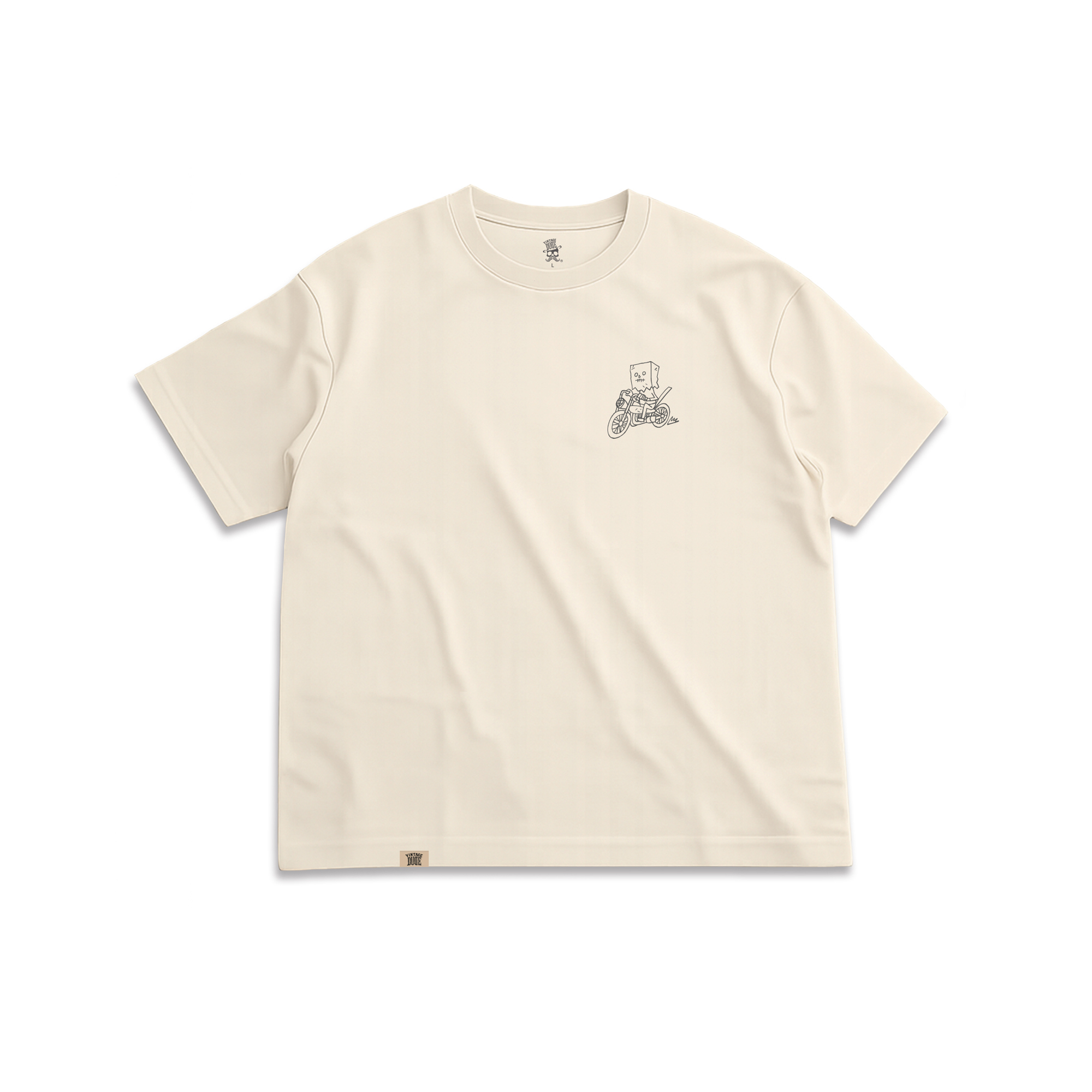 乾淨俐落的手繪線條,描繪著經典「紙袋人」騎乘重機的身影。這是在向早期報紙的社論插畫致敬——簡約、詼諧,且保持低調。