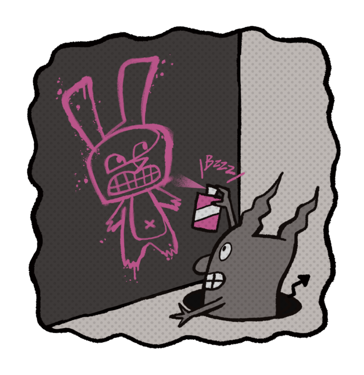 直到有一天,Dabbi 撿到了一罐破舊的噴漆。他對著牆面揮灑,把所有孤單與憤怒都噴上去;線條歪斜,顏色糊成一團,卻一步一步拼出了他腦海裡的形狀——一隻皺著眉的兔子。Dabbi 一筆一筆把牠從想像拉到現實,最後,整幅塗鴉像紙片一樣從牆面抽離,啪嗒一聲落在地上。